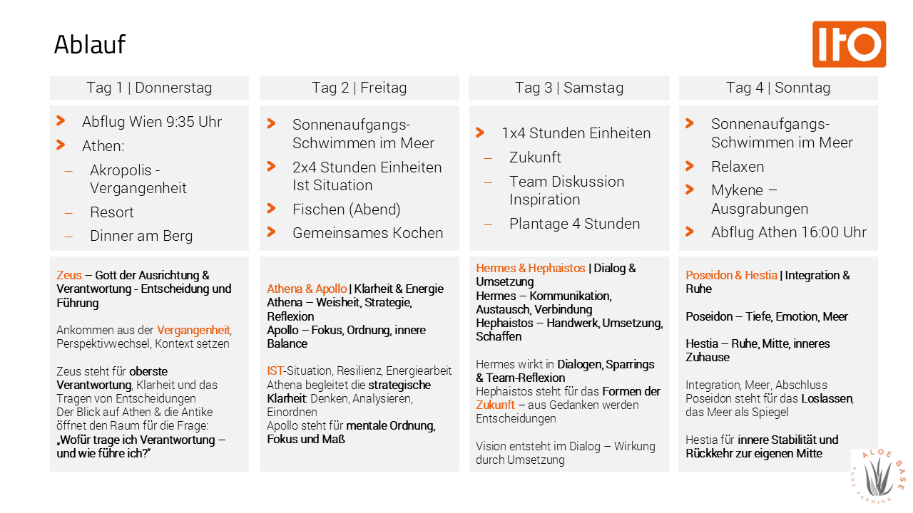 Im neuen ITO × Aloe Base Self – Empowerment Retreat in Griechenland verbinden wir moderne Diagnostik mit praktischer Erfahrung. Gemeinsame intensive Reflexion und inspirierende Ruhe am Meer schaffen den Rahmen für mehr mentale Klarheit und Präzisierung der eigenen Positionierung und Strategie.